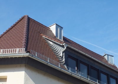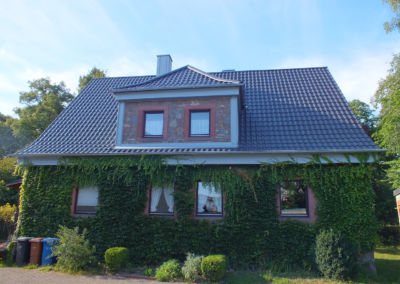 Erlus Biberschwanzziegel, Farbe brazilbraun engobiert, Gaubenverkleidung mit Naturschiefer, eingehende Wangenkehle aus Naturschiefer